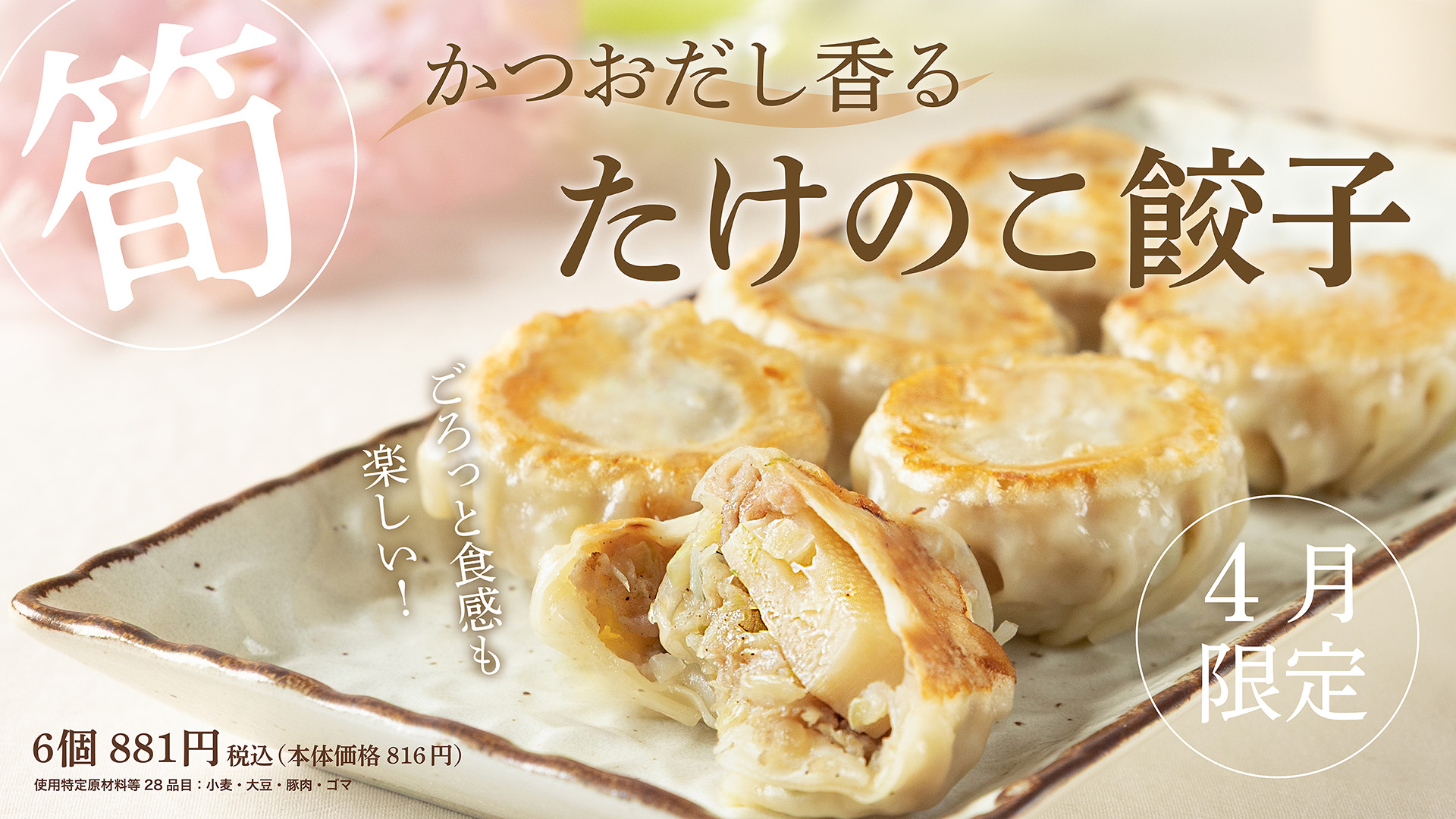 和風だしで柔らかく煮付けた「たけのこ」を餃子の具と一緒に包み込みました。